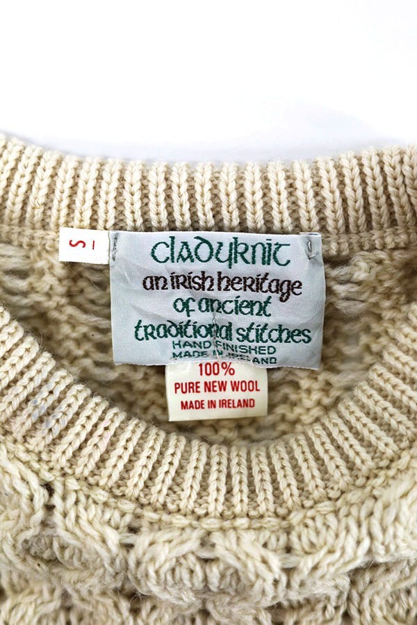Used 90s IRELAND Claournic Ivory Wool Fisherman Aran Knit Size S 古着
