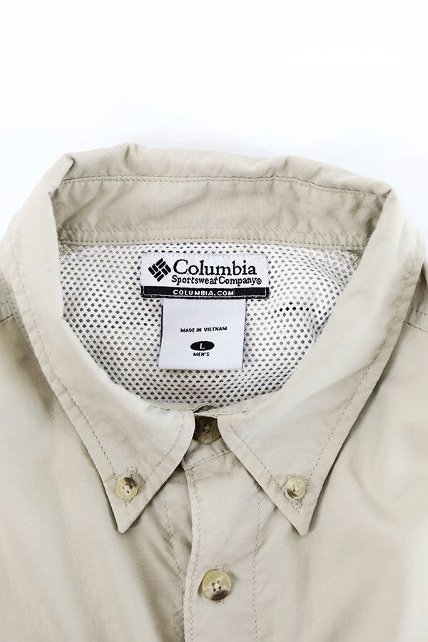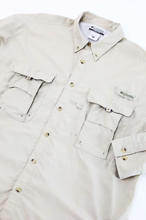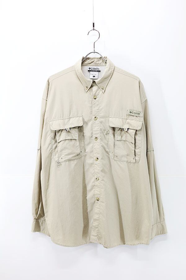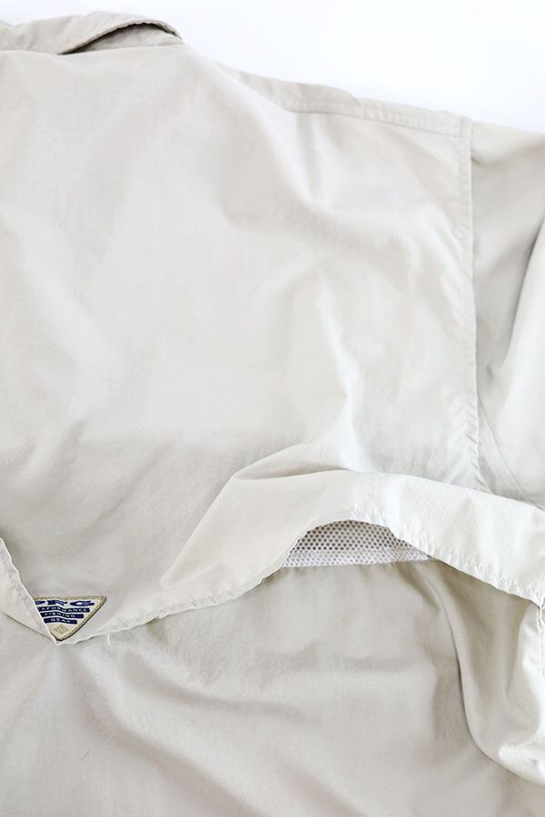 コロンビアが1990年代頃に力を入れて展開したフィッシングライン『PFG(Performance Fishing Gear)』シリーズのナイロンシャツで、カラーはベージュ。