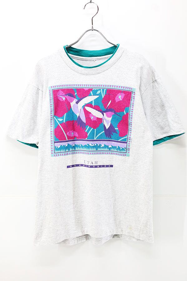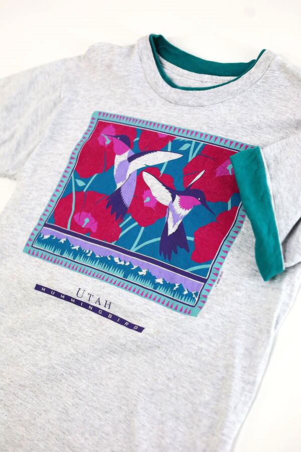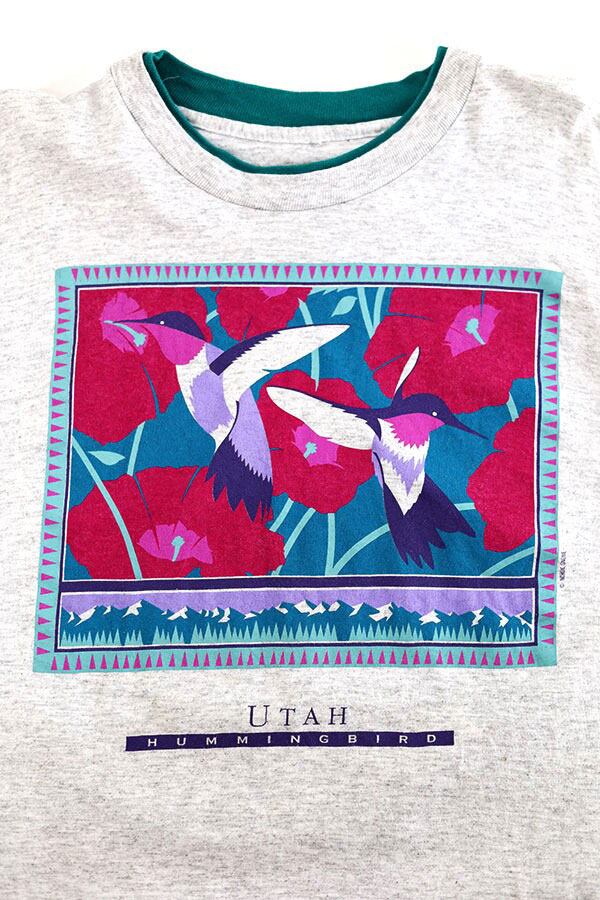 Used Womens 90s 2Tone UTAH Humming bird Art Graphic T-Shirt Size L 相当 古着